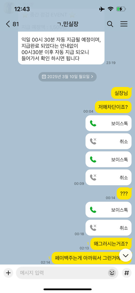 자꾸전화와서 이용해달라고해서 이용햇다가 두달간 3천정도 빠그라졋는데 페이백좀 먼저정산해주면 안되냐니깐 차단해버리네요