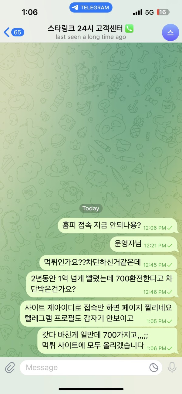 c.3.31 12시경 700중 500환전 신청 하였으나 아이디 차단 및 텔레그램 고객센터 차단당하였습니다.