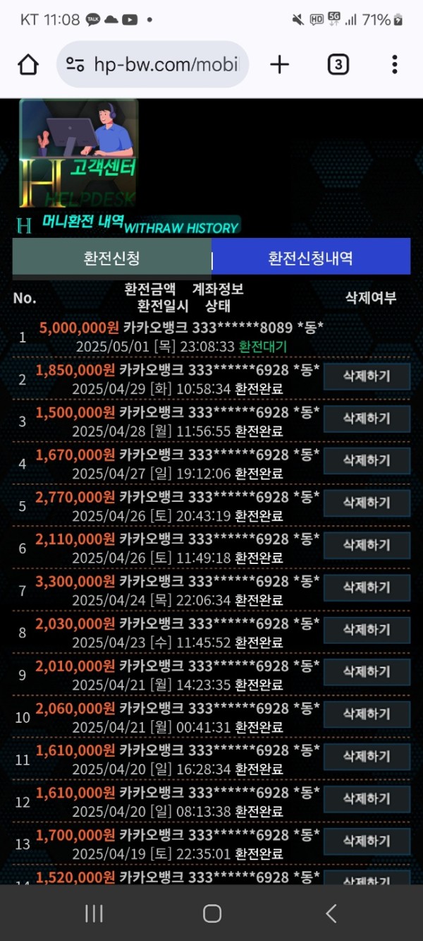 갑자기 전화가옴 갑자기 500환을쳤으니 500을 입금하면 나머지 금액이랑 한번에 합산 2700정도를 환해주겠다고함