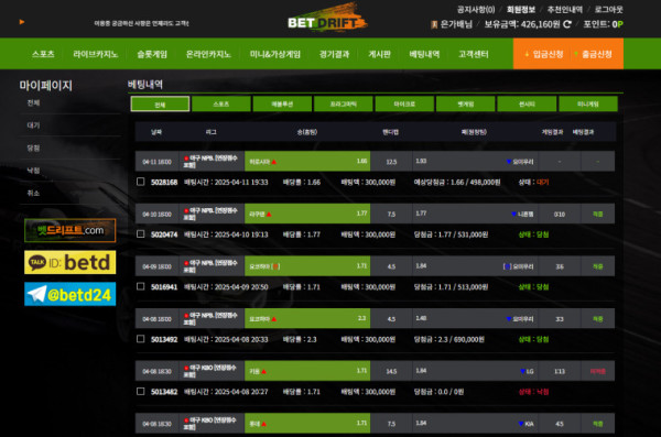 보름정도 이용하고 충환전하면서 포인트안받고 이용했습니다. 배팅 대기상태 까지 되고 결과처리 남았는데 취소하고, 계정차단한상태입니다. 라이브배팅4월18일 요미우리 7회배팅하고 9회에 겨우1점 내어주어서 오바 나고, lg 6.5오버 배팅 했는데 미적중, 한화 7회2사 1,2루 있을때 배팅했는데 아무런문제도 없는 배팅 을 라이브작업배팅이라고 합니다. 무엇이 라이브작업배팅인지 말하지도 않고 고객센터 차단 한 상태이며, 설명도 없이 몰수합니다. 돈땄다고 계정차단 몰수하는 사이트 입니다. 어떤문제가 있다면 상의를 해야지, 일방적으로돈땄다고 계정차단하는 사이트 입니다. 벳드리프트 관리자는 고객센터 차단풀고 연락주세요