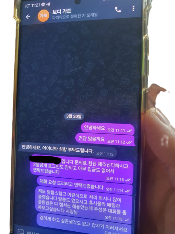 환전해준다더니 아이디 차단시키는 몰상식한 행동 그만하고 얼른 연락 주소