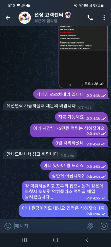 15충 79만 만들고 스포츠 4만 배팅후 75만 환전하니 작업배팅 의심된다고 환전못해준다네요 ㅋ아니 파워볼배팅만했는데 뭔 작업배팅이야 픽받아서 작업한거 같다는데 그런픽 있음 즈그가 배팅해서 지네가 돈벌겠지 뭔 개소리 하면서 작업자랑 대화한거 주면 원금은 주겠다는데 나혼자 생각한걸 뭔수로 보내주냐고 ㅋㅋ 십 구멍가게임 75만원도 환전 못해주면서 뭔....