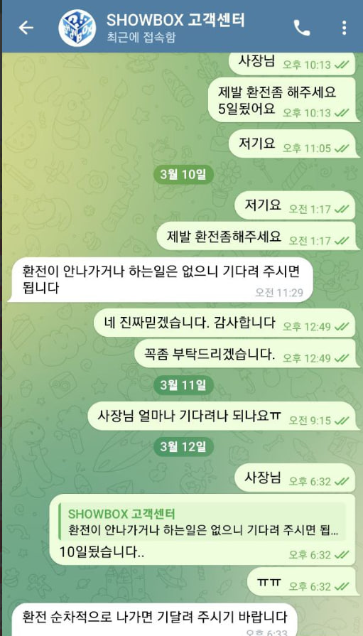 환전 신청한지 1달전부터 했는데 계속 똑같은말만 하구 결국 사이트폐지 됬음 회원님들 쇼박스 다른 계열 오픈하면 꼭좀 알려주세요ㅠㅠㅠㅠ 배팅도 느바 3경기 배팅했는데 화가 너무나네요