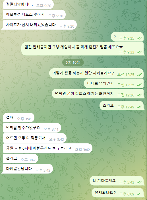 그러더니 중간에 연락와서는 에볼루션이 막혀서 에볼루션에서 디도스걸어서 뭐 사이트가 다 닫혔다나?