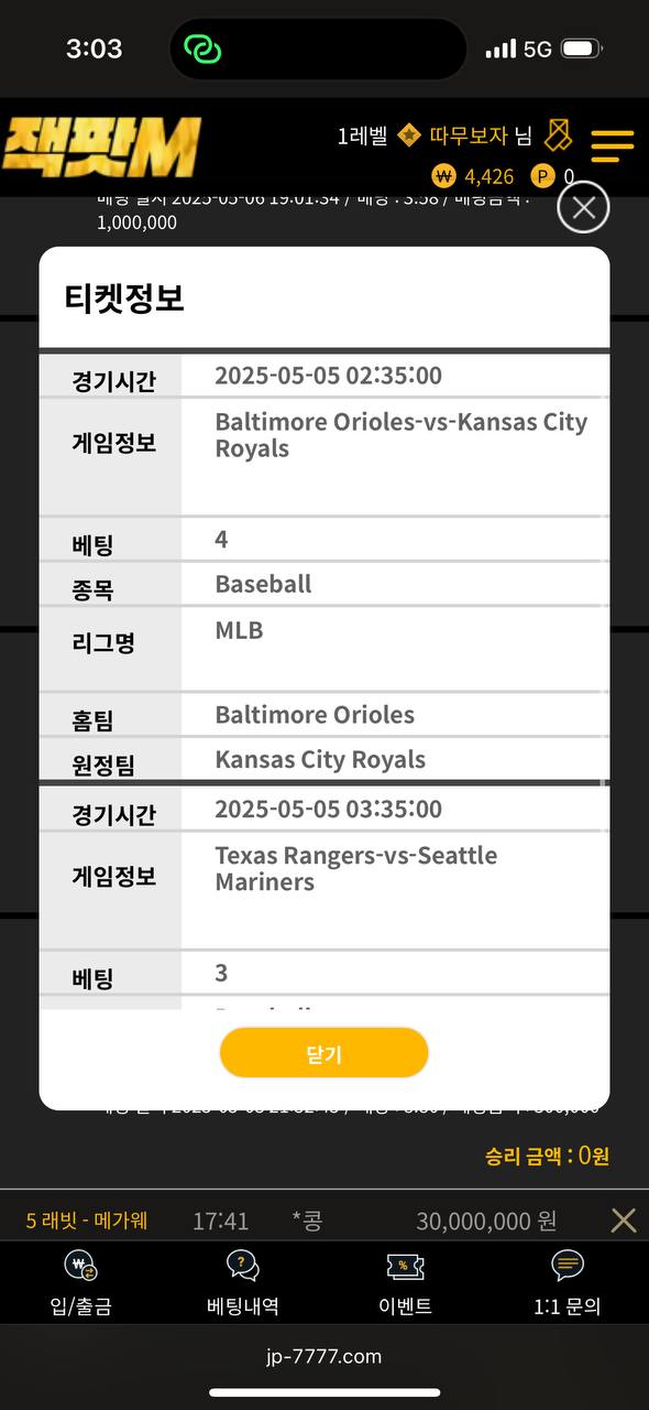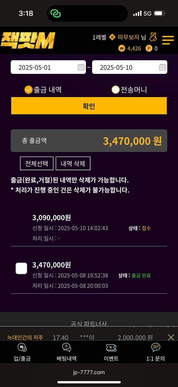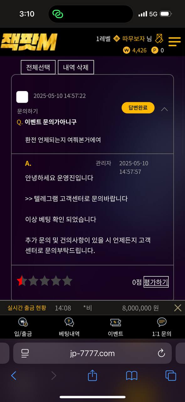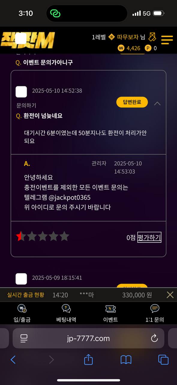 5월 7일경 드디어 처음으로 한번 적중해서 347만원 환전 눌렀는데 환전 되길래 돈문제없는 잘나오는 사이트구나 하고 사용하고 있었습니다 . 근데 사건은 어제 밤 자기전에 야구배팅하고 오늘 당첨된거 확인하고 환전눌렀는데 환전이 2시간가까이 지연되길래 문의했더니 텔레그램을 달라고 하네요.