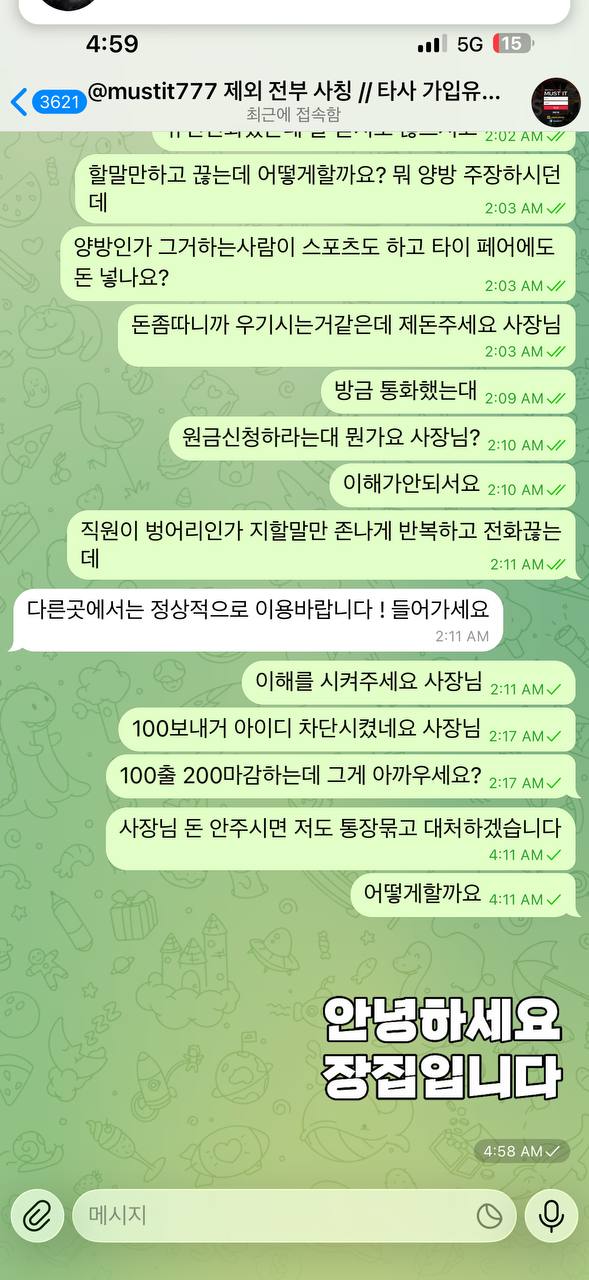 유선 연결해 달라고 하니 전화가 와서 양방 베팅인지부터 캐묻고, 환전 받으려면 어디선가 올라온 양방 블랙리스트 증명을 가져오라는 식으로 황당한 말을 13번쯤 반복하다가 끊어버렸습니다. 고객센터로 연결해도 똑같은 사람이 받아서 또 엉터리 소리만 하다가, 결국 제 아이디에 멋대로 들어와서 100만 원만 환전 처리하고 계정을 차단해 버렸어요.