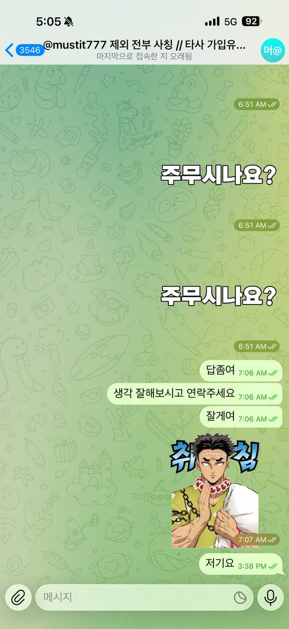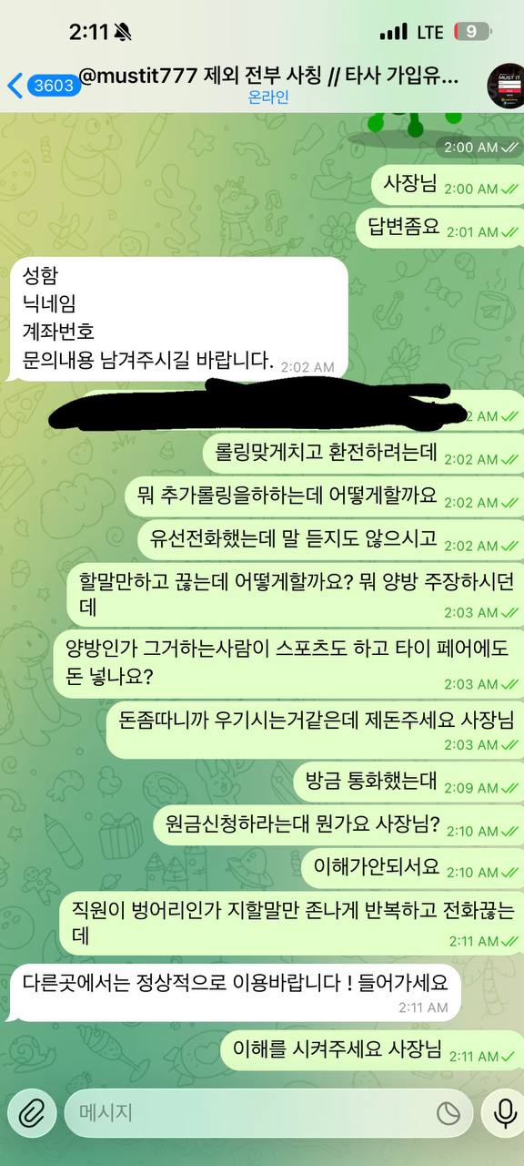 머스트잇이라는 사이트에서 먹튀당했습니다. 100만 원 입금하고 거의 한 시간 동안 게임했는데, 규정 롤링보다 훨씬 더 채웠어요. 그런데 게임 끝나고 200만 원 환전 신청하니까 갑자기 롤링 600%를 채우라는 터무니없는 소리를 하더군요.